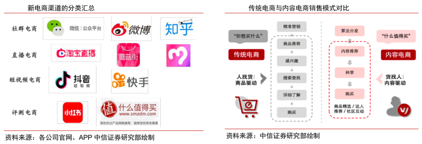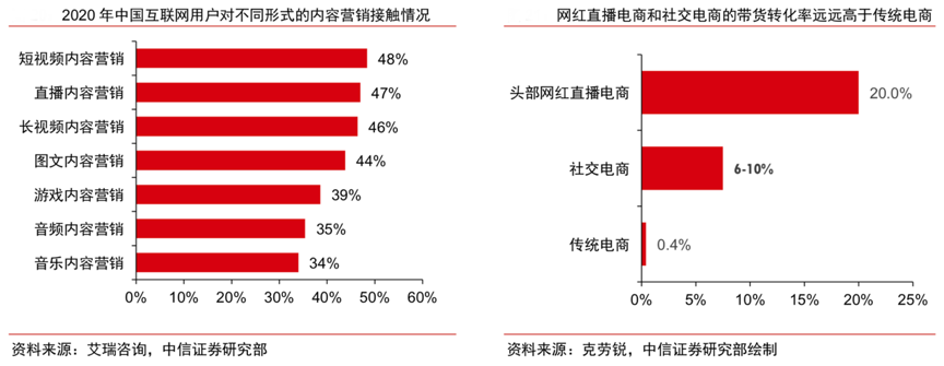 經典案例:根據(jù)艾瑞咨詢、克勞銳、中信證券研究所等綜合資訊表明,隨著新媒體的迅速發(fā)展,內容電商和社交電商渠道開始接力增長,從原來單一的平臺電商向分散化的多元電商(如主播帶貨、達人測評、大 V 推薦等)演變,成為小家電的重要新渠道。在用戶觸達上,互聯(lián)網用戶對 短視頻內容營銷、直播營銷接觸率均超半數(shù),新興電商傳播力優(yōu)勢明顯;在用戶轉化上,網紅直播電商帶貨轉化率以及社交電商轉化率遠高于傳統(tǒng)電商。
