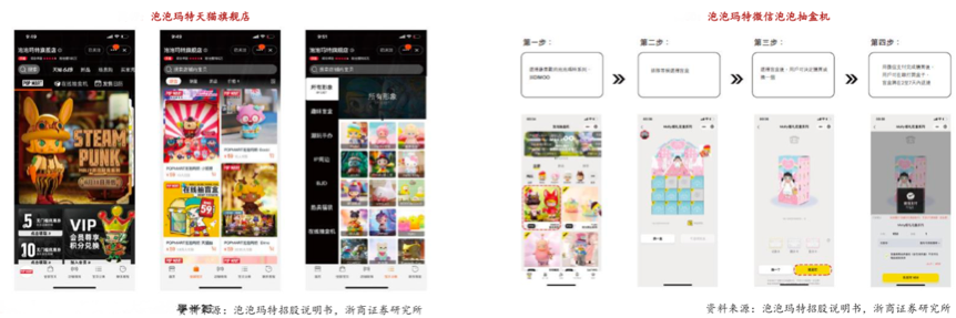 經(jīng)典案例:根據(jù)泡泡瑪特招股說明書、浙商證券研究等綜合資訊表明,泡泡瑪特渠道廣泛,其線上渠道包括天貓旗艦店、微信泡泡抽盒機、葩趣及其他中國主流電商平臺。2019年,分別實現(xiàn)線上渠道收益 5.39億元,總收益占比32.0%。其中的微信泡泡抽盒機:2018年9月上線,通過小程序內(nèi)嵌互動功能,增加智能手機上盲盒的銷售。2019年產(chǎn)生收益2.71億元;葩趣則自營線上社區(qū),包含潮流玩具文化資料及更新、電子商務(wù)及社交等。
