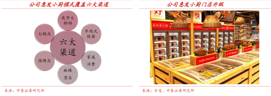 經(jīng)典案例:根據(jù)公司公告、百度和中泰證券研究所等綜合資訊表明,“惠發(fā)小廚”是惠發(fā)食品2018 年開始嘗試的一種業(yè)務(wù)模式,通過開設(shè)食材(火鍋燒烤麻辣燙 等)一站式采購連鎖超市,包含 600 多種食材,每一種均由廠家直供, 解決火鍋料產(chǎn)品采購品類眾多、費時費力的現(xiàn)狀,滿足消費者一站式低價購齊需求,其本質(zhì)上是一種“一站式食材服務(wù)體系”。