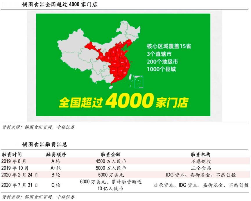 經(jīng)典案例:根據(jù)鍋圈食匯官網(wǎng)、中銀證券等綜合資訊表明,自2015 年成立,2020 年 8 月鍋圈食匯門店數(shù)量已突破 4000 家,覆蓋 15 個省 3 個直轄市,200個地市。同時鍋圈食匯已完成 6000 萬美元“C 輪”融資,發(fā)展迅猛。