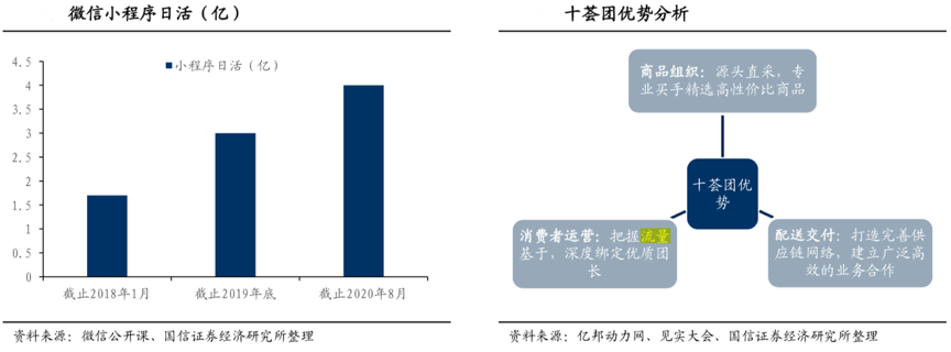 經(jīng)典案例:根據(jù)微信公開課、億邦動(dòng)力網(wǎng)、見實(shí)大會(huì)、國信證券經(jīng)濟(jì)研究所等綜合資訊表明,十薈團(tuán)微信小程序截止2020年8月,日活超過4億,這為社區(qū)團(tuán)購企業(yè)提供了極好 的發(fā)展土壤。同時(shí)其自2019年便開始做團(tuán)長直播帶貨,將產(chǎn)品篩選過程、制作工藝及廠房等信息通過直播的形式展現(xiàn)在消費(fèi)者面前,從而提高消費(fèi)者的信任度與粘性,帶動(dòng)部分單品銷售額從直播前的萬元增長至十萬元。