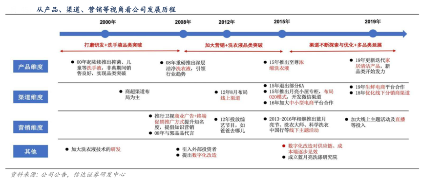 經(jīng)典案例:根據(jù)公司公告、信達(dá)證券研發(fā)中心等綜合資訊表明,1992年藍(lán)月亮推出首款產(chǎn)品強(qiáng)力型油污克星,率先從廚房清潔類產(chǎn)品入手;2000 年推出藍(lán)月亮洗手液,切入個(gè)人清潔領(lǐng)域;同時(shí),其研發(fā)中心 96 年起致力于洗衣液研發(fā)及技術(shù)革新,旨在解決提升潔凈能力、保護(hù)衣物纖維、降低生產(chǎn)及洗滌過程中能耗等難題,歷時(shí) 12 年研發(fā)打磨推出首款洗衣液產(chǎn)品(藍(lán)月亮深層潔凈洗衣液),在衣物護(hù)理行業(yè)快速突破。