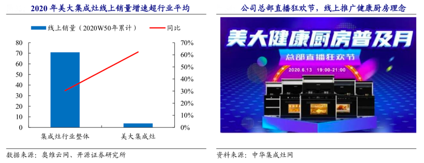 經(jīng)典案例:根據(jù)奧維云網(wǎng)、中華集成灶網(wǎng)、開源證券研究所等綜合資訊表明,2020年美大集成灶公司授權(quán)線下經(jīng)銷商開設(shè)線上專賣店,并加大對新媒體渠道微博、抖音、快手等的投入,通過直播帶貨提高消費者認(rèn)知度,增加線上銷量。根據(jù)奧維云網(wǎng)數(shù)據(jù),截至 2020W50,美大集成灶線上銷量年累計達 3.83 萬臺,同比增長 62.29%,較行業(yè)整體線上銷量增速超出 31.87pct,電商渠道建設(shè)效果較為亮眼。
