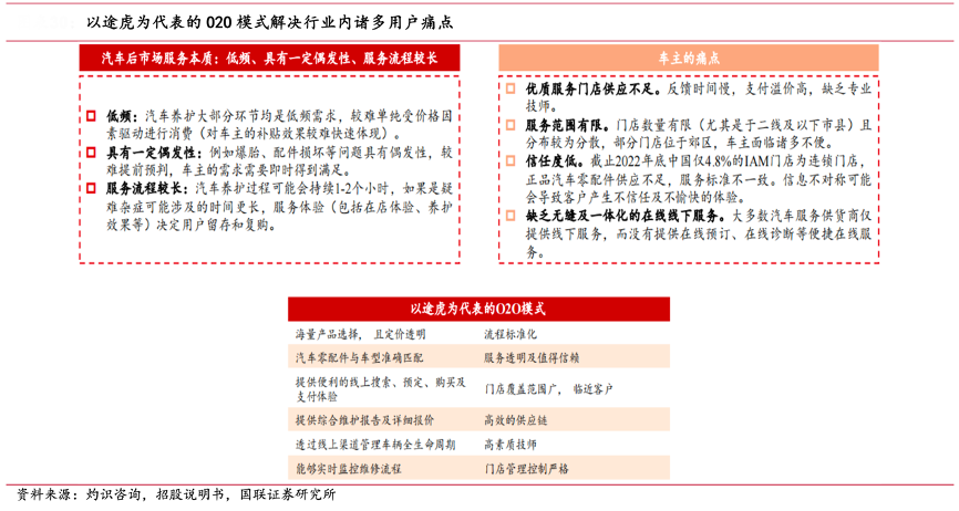 經(jīng)典案例:根據(jù)灼識(shí)咨詢、招股說明書、國聯(lián)證券研究所等綜合資訊表明,以途虎為代表的 O2O 模式解決汽車后市場(chǎng)諸多用戶痛點(diǎn)。O2O 汽車服務(wù)模式將線 上平臺(tái)及線下門店的優(yōu)點(diǎn)相結(jié)合,線上平臺(tái)為線下運(yùn)營提供龐大的客戶流量及數(shù)據(jù) 分析;線下門店與集中式供應(yīng)鏈系統(tǒng)合作,采用統(tǒng)一的數(shù)字化客戶管理及訂單系統(tǒng), 并且線下門店受到平臺(tái)的實(shí)時(shí)嚴(yán)格管控。