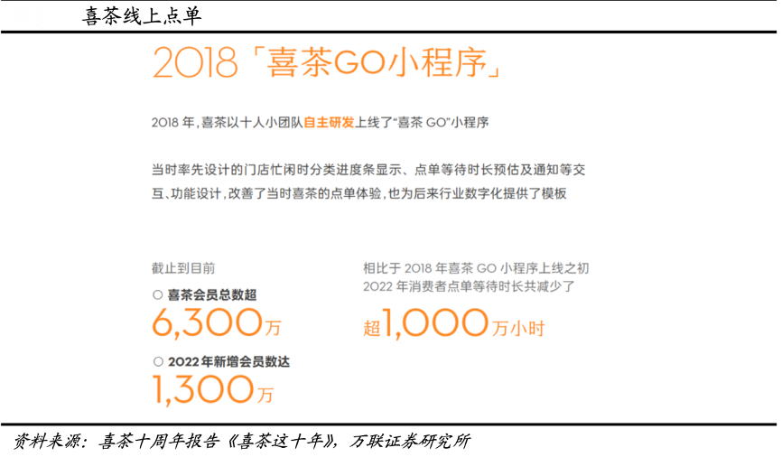 經(jīng)典案例:根據(jù)喜茶十周年報(bào)告《喜茶這十年》、萬(wàn)聯(lián)證券研究所等綜合資訊表明,喜茶門(mén)店數(shù)字化率也逐年升高,2018年,喜茶以十人小團(tuán)隊(duì)自主 研發(fā)上線了“喜茶 GO”小程序當(dāng)時(shí)率先設(shè)計(jì)的門(mén)店忙閑時(shí)分類(lèi)進(jìn)度條顯示、點(diǎn)單等待時(shí)長(zhǎng)預(yù)估及通知等交互、功能設(shè)計(jì),改善了當(dāng)時(shí)喜茶的點(diǎn)單體驗(yàn),相比于2018年喜茶 GO 小程序上線之初,2022年消費(fèi)者點(diǎn)單等待時(shí)長(zhǎng)共減少了超1000萬(wàn)小時(shí)。