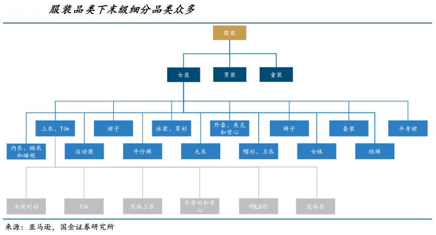 經(jīng)典案例:根據(jù)亞馬遜、國(guó)金證券研究所等綜合資訊表明,亞馬遜細(xì)分品類眾多,單品類提份額邏輯持續(xù)有效。以女裝為例,次級(jí)細(xì)分品類有內(nèi)衣、上衣、 T 恤、裙子等,而上衣、T恤這一次級(jí)細(xì)分品類又有女裝襯衫、T 恤、長(zhǎng)版上衣等等末級(jí)品類,針對(duì)特定末級(jí)品類的產(chǎn)品布局,能夠迅速幫助服裝品牌打開(kāi)市場(chǎng),提高市場(chǎng)占有。