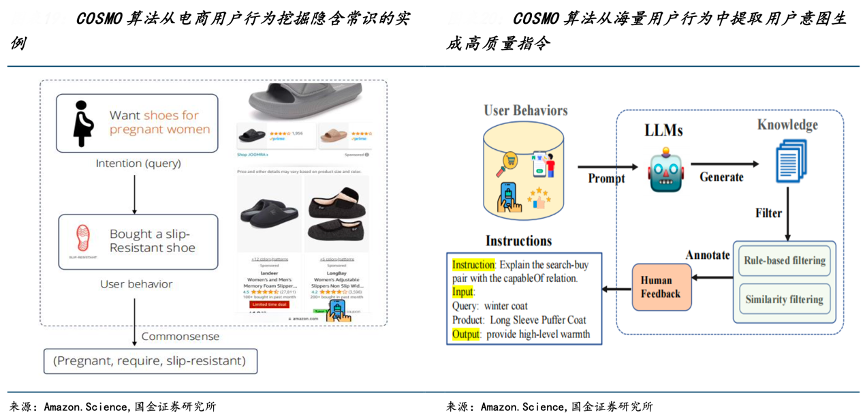 經(jīng)典案例:根據(jù)Amazon.Science、國(guó)金證券研究所等綜合資訊表明,亞馬遜推薦算法以用戶為導(dǎo)向由 A9 更新到 A10,引入 COSMO 算法,提升銷售轉(zhuǎn)化率。 A10 通過(guò)降低付費(fèi)廣告影響、重視品牌影響力和營(yíng)銷轉(zhuǎn)化效率,以削弱賣(mài)家對(duì)流量的把 控。COSMO 算法利用大語(yǔ)言模型,將常識(shí)知識(shí)融入搜索流程,從產(chǎn)品為中心轉(zhuǎn)向客戶為中心,使搜索結(jié)果與用戶意圖更一致。經(jīng)測(cè)試,將 COSMO 整合到約 10%的美國(guó)站流量后,產(chǎn)品銷售額增長(zhǎng) 0.7%,相當(dāng)于年增 49 億美金銷售額。