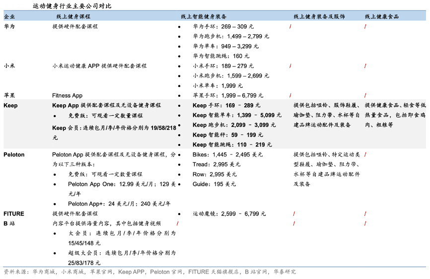 經(jīng)典案例:根據(jù)華為商城、小米商城、蘋(píng)果官網(wǎng)、Keep APP、Peloton官網(wǎng)、FITURE天貓旗艦店、B站官網(wǎng)、華泰研究等綜合資訊表明,平臺(tái)業(yè)務(wù)方面,Keep 平臺(tái)的會(huì)員滲透率由 2019 年 3.5%提高至 2023 年 10.7%, 2023 年會(huì)員及線上付費(fèi)內(nèi)容年收入同比增長(zhǎng) 11.4%至 10.0 億元。