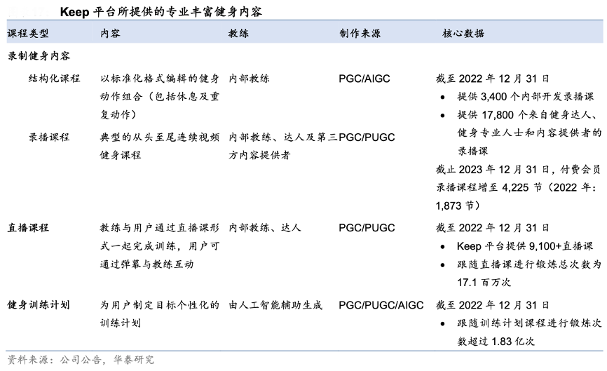 經(jīng)典案例:根據(jù)公司公告、華泰研究等綜合資訊表明,Keep 深化健身內(nèi)容布局,提供錄制、直播課以及訓(xùn)練計(jì)劃等內(nèi)容。錄制課方面,Keep 提供結(jié)構(gòu) 化課程、內(nèi)部開(kāi)發(fā)且由內(nèi)部教練或達(dá)人示范的視頻課程以及健身百科知識(shí),課程內(nèi)容涵蓋 力量訓(xùn)練、有氧運(yùn)動(dòng)、舞蹈、拳擊、拉伸、瑜伽等內(nèi)容。截至 2022 年末,Keep 提供 17,800 個(gè)錄播課;用戶(hù)跟隨錄播課的鍛煉次數(shù)達(dá) 13 億次。