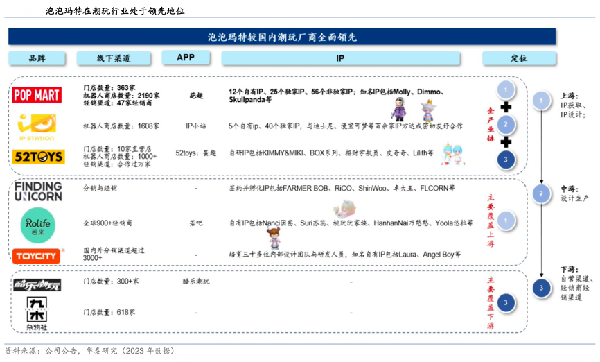 經(jīng)典案例:根據(jù)公司公告、華泰研究等綜合資訊表明,國(guó)內(nèi)將潮流玩具和盲盒銷(xiāo)售模式相結(jié)合的泡泡瑪特 與名創(chuàng)優(yōu)品,均通過(guò)自身努力和不斷創(chuàng)新,實(shí)現(xiàn)了 IP 運(yùn)營(yíng)、產(chǎn)品設(shè)計(jì)、品牌、渠道和供應(yīng) 鏈全產(chǎn)業(yè)鏈打通,2023 年泡泡瑪特中國(guó)內(nèi)地收入同比增 25.7%,名創(chuàng)優(yōu)品也實(shí)現(xiàn)了國(guó)內(nèi)線下 GMV 同比 39%的快速增長(zhǎng)。