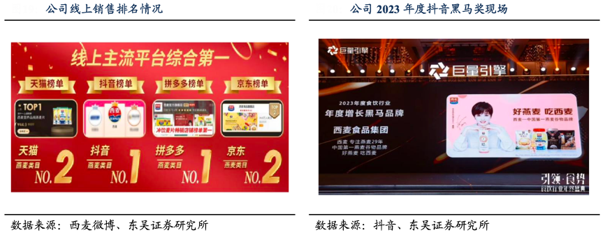 經(jīng)典案例:根據(jù)西麥微博、抖音、東吳證券研究所等綜合資訊表明,西麥已經(jīng)建立起完整的電商渠道,目前已經(jīng)覆蓋天貓、京東、拼多多等 B2C 平臺,京東京喜通、阿里零售通等 B2B 平 臺,抖音、快手、小紅書等興趣電商平臺,與京東到家、美團、多點等 O2O 大平臺展開深入合 作。2023 年,線上銷售同比增長 30%,保持高速增長。在抖音 GMV 超 3 億元,同比增長超過 70%,同 時獲抖音平臺“黑馬獎”。
