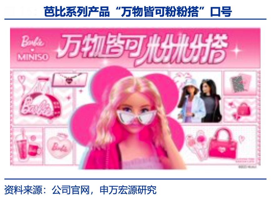 經(jīng)典案例:根據(jù)公司官網(wǎng)、申萬(wàn)宏源研究等綜合資訊表明,名創(chuàng)優(yōu)品芭比系列革新設(shè)計(jì),采用“萬(wàn)物皆可粉粉搭”理念,大量應(yīng)用標(biāo)志性芭比粉,不僅挑戰(zhàn)傳統(tǒng)觀念,實(shí)現(xiàn)粉色日?;€與電影《芭比》傳達(dá)的“無(wú)限可能”相呼應(yīng)。