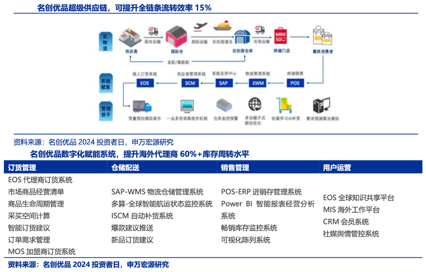 經(jīng)典案例:根據(jù)名創(chuàng)優(yōu)品2024投資者日、申萬(wàn)宏源研究等綜合資訊表明,“供應(yīng)鏈”是名創(chuàng)優(yōu)品核心競(jìng)爭(zhēng)力,其利用科技賦能進(jìn)一步打造超級(jí)供應(yīng)鏈,從多、 快、好、省四方面共同發(fā)力,2023 年整體供應(yīng)鏈的流轉(zhuǎn)效率提升了 15%。通過(guò)一系列的團(tuán) 隊(duì)和信息系統(tǒng)賦能,目前海外代理商、合作伙伴門(mén)店周轉(zhuǎn)水平對(duì)比之前實(shí)現(xiàn)超過(guò) 60% 提升。