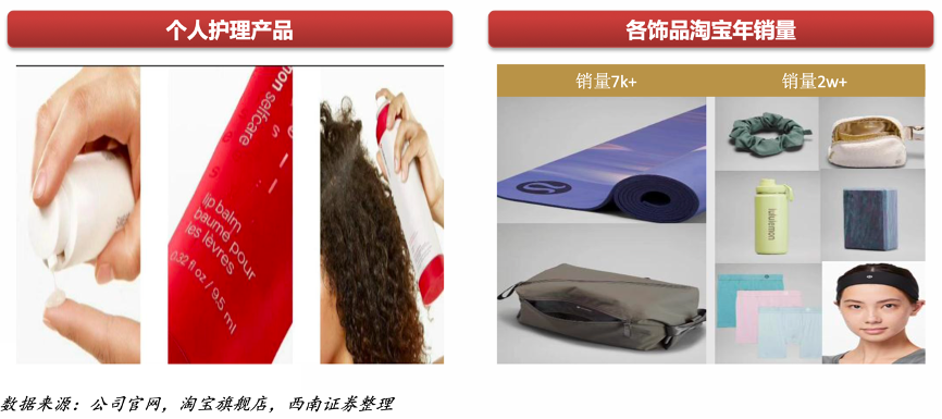 經(jīng)典案例:根據(jù)公司官網(wǎng)、淘寶旗艦店、西南證券等綜合資訊表明,Lululemon近幾年在大力擴張自己產(chǎn)品品類,2019年公司在北美市場推出了個人護理產(chǎn)品,包括唇膏、面部保濕霜、香體噴霧和免洗洗發(fā)水,價格區(qū)間在12-26美元(約81- 176人民幣)。在國內市場,公司不斷擴展定價相對較低的配飾類(如頭飾、運動水壺及瑜伽器材、包類、內衣),有望提升連帶銷售率。