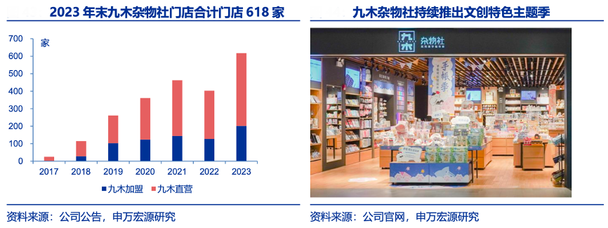經(jīng)典案例:根據(jù)公司公告、公司官網(wǎng)、申萬宏源研究等綜合資訊表明,九木雜物社是以 15-29 歲的品質(zhì)女生作為目標(biāo)消費(fèi)群體,銷售的產(chǎn)品主要為文具文創(chuàng)、益智文娛、實(shí)用家居等品類,店鋪主要分布在各城市核心商圈的優(yōu)質(zhì)購 物中心。早期九木雜物社直營模式積累運(yùn)營經(jīng)驗(yàn),2018 年 7 月開啟加盟模式,2023 年末 九木雜物社門店 618 家。