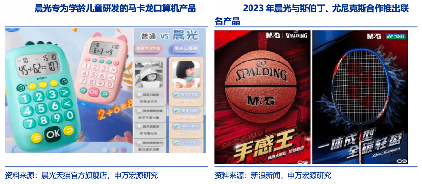 經(jīng)典案例:根據(jù)晨光天貓官方旗艦店、新浪新聞、申萬宏源研究等綜合資訊表明,晨光股份在品類延展上,抓住目標(biāo)人群的消費趨勢與訴求,聚焦細(xì)分市場新開發(fā)體育品類,包含足籃羽乒排五大球品類,首創(chuàng)行業(yè)內(nèi)最清晰的產(chǎn)品定位劃分,2023 年與斯伯丁(SPALDING)、尤尼克斯(YONEX)等知名運動品牌達(dá) 成聯(lián)名合作。