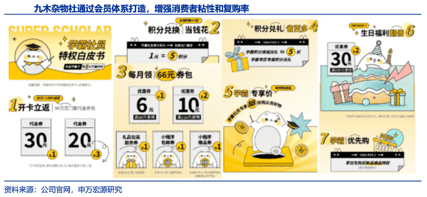 經(jīng)典案例:根據(jù)公司官網(wǎng)、申萬宏源研究等綜合資訊表明,2022年九木雜物社自研會員系統(tǒng)上線,包括會員小程序商城,會員運營管理、會員數(shù)據(jù)管理、社會化營銷工具包。通過線上公域和私域的運營,提升九木雜物社 DTC 的消費者觸達(dá)能力,線上公域電商穩(wěn)定增長,拼多多、抖音、社區(qū)電商、小程序等新型渠道持續(xù)增長,重點發(fā)力私域社群運營及到家社區(qū)電商。