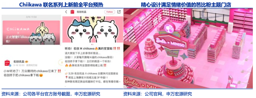 經(jīng)典案例:根據(jù)公司各平臺官方帳號截圖、公司官網(wǎng)、申萬宏源研究等綜合資訊表明,在芭比、Loopy 兩次聯(lián)名中,名創(chuàng)優(yōu)品主題門店頗具亮點(diǎn)。如長沙芭比概念店和杭州 Loopy 旗艦 店等,利用鮮明 IP 主題設(shè)計(jì)(如芭比粉色調(diào)、Loopy 沉浸式場景)及創(chuàng)新技術(shù)(如裸眼 3D 天幕),成為城市網(wǎng)紅打卡點(diǎn),極大增強(qiáng)了顧客體驗(yàn)與品牌曝光度。