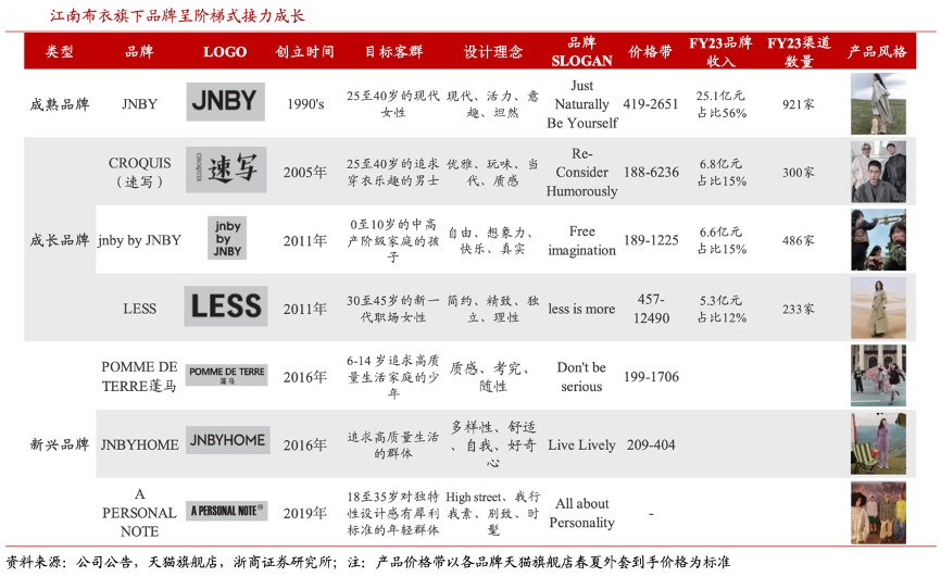 經(jīng)典案例:根據(jù)公司公告、天貓旗艦店、浙商證券研究所等綜合資訊表明,江南布衣將旗下品牌分為成熟品牌、成長品牌和新 興品牌,三個品牌梯隊從年齡段、性別、風格等維度,成熟品牌 JNBY 針對 25-50 歲現(xiàn)代女性,成 長品牌速寫針對 25-40 歲男性、jnby by JNBY 針對 0-10 歲兒童、LESS 針對 30-45 歲職場女 性,新興品牌蓬馬針對 6-14 歲家庭少年、JNBYHOME 是針對追求高質(zhì)量生活人群的家居 服品牌、APERSONALNOTE針對18-35歲強調(diào)設(shè)計感的年輕群體。