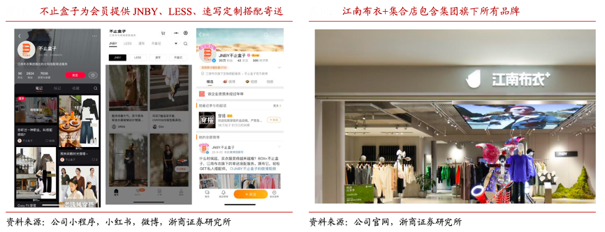 經(jīng)典案例:根據(jù)公司公告、浙商證券研究所等綜合資訊表明,江南布衣公司推出江南布衣+多品牌集合店等新興消費(fèi)場景和產(chǎn)品,通過“不止盒子私人搭配”、“跨品牌會員權(quán)益”、“免運(yùn)費(fèi)寄送”、“服裝高端洗護(hù)”等會員專屬體驗(yàn)的消費(fèi)場景,加強(qiáng)粉絲粘性。FY2023H2、FY2024H1 江南布衣+集合店收入同比分別+119%、+85%至 1.05、1.38 億元,彰顯集團(tuán)品牌連帶力與新渠道的快速增長。