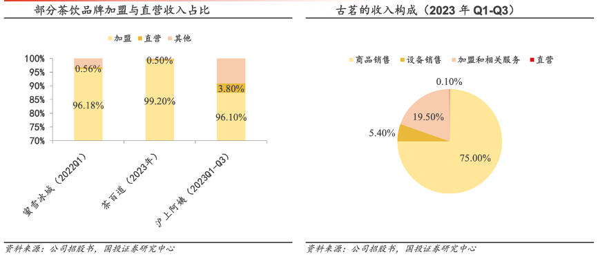 經(jīng)典案例:根據(jù)公司招股書、國(guó)投證券研究中心等綜合資訊表明,從加盟和直營(yíng)收入角度,我們可以看到蜜雪冰城、茶百道和滬上阿姨的加盟收入占比均已超過(guò)了96%,加盟收入在主營(yíng)業(yè)務(wù)收入中占據(jù)絕對(duì)主導(dǎo)地位。加盟模式下絕大部分收入來(lái)自于向加盟門店銷售商品及設(shè)備,古茗 2023 年前三個(gè)季度中商品和設(shè)備銷售以及加盟和相關(guān)服務(wù)的收入占比達(dá)到了 99.9%。