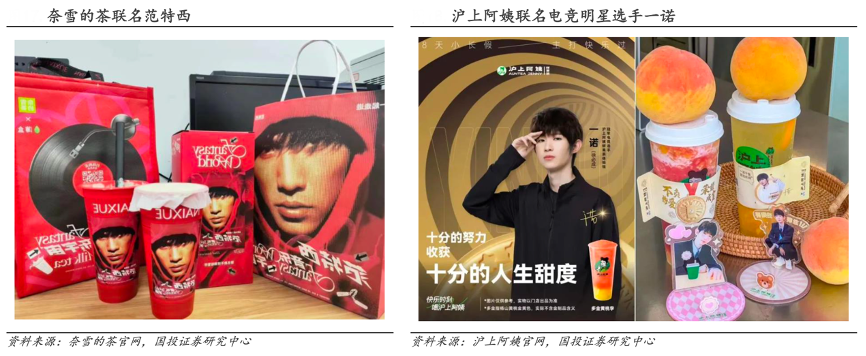 經典案例:根據(jù)奈雪的茶官網(wǎng)、滬上阿姨官網(wǎng)、國投證券研究中心等綜合資訊表明,2023年9月,在周杰倫《范特西》專輯 發(fā)行 22 周年之際,奈雪的茶聯(lián)名薄盒上線范特西音樂宇宙系列聯(lián)名產品,同時還推出了 CD 造型的杯墊、印有周杰倫專輯封面的不銹鋼杯子和手提袋,引發(fā)了一波打卡熱潮。在 2023 年亞運會開幕前夕,滬上阿姨就邀請了一諾擔任鮮果茶體驗官,消息已經發(fā)出一度刷屏了電競愛好者的社交媒體。