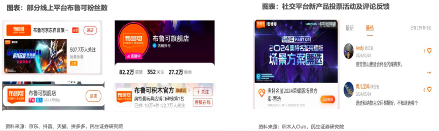 經(jīng)典案例:根據(jù)京東、抖音、天貓、拼多多、積木人Club、民生證券研究院等綜合資訊表明,可通過內(nèi)容驅(qū)動的互聯(lián)網(wǎng)營銷策略以及全渠道的銷售網(wǎng)絡(luò),布魯可實(shí)現(xiàn)了良好的營銷和銷售效果。在京東、微信、天貓、抖音、拼多多、快手、微博、小紅書、嗶哩嗶哩等線上平臺共擁有超過1,100萬粉絲,是位列中國玩具企業(yè)前二的品牌。