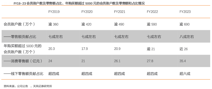經(jīng)典案例:根據(jù)公司公告、天風(fēng)證券研究所等綜合資訊表明,江南布衣精心設(shè)計(jì)的會(huì)員制度提升了消費(fèi)者體驗(yàn),為品牌提供深入的市場(chǎng)洞察。FY19-23,公司會(huì)員賬戶數(shù)由逾 360 萬(wàn)個(gè) 增長(zhǎng)到逾 690 萬(wàn)個(gè),零售額貢獻(xiàn)占比增長(zhǎng)至八成左右;年購(gòu)買額超過 5000 元的會(huì)員賬戶 數(shù)由 20.3 萬(wàn)個(gè)增長(zhǎng)到近 26 萬(wàn)個(gè),這部分客戶的消費(fèi)零售額由 24 億元增長(zhǎng)至 35.4 億元 (CAGR10.2%),線下零售額貢獻(xiàn)占比超過六成。