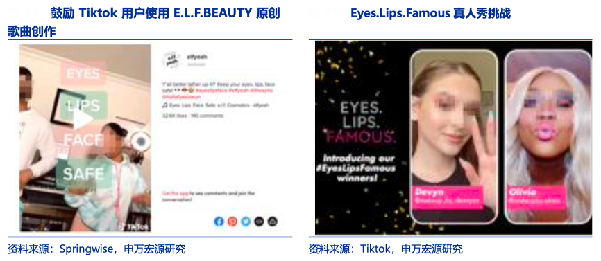 經(jīng)典案例:根據(jù)Springwise、Tiktok、申萬宏源研究等綜合資訊表明,2019 年,TikTok 成為最熱門的新 平臺,但參與其中的美妝品牌卻寥寥無幾。E.L.F. BEAUTY 發(fā)現(xiàn)空白新渠道,并在 Tiktok 上發(fā)布原創(chuàng)品牌歌曲,鼓勵用戶使用帶#EyesLipsFace 的背景音樂進行創(chuàng)作,收獲首批 Z 世代消費客群。公司緊接著發(fā)起 TikTok 真人秀挑戰(zhàn) #EyesLipsFamous,以 TikTok 頂級 影響者、專業(yè)化妝師等的指導(dǎo)及為期一個月的“美容營”作為獎勵,號召用戶分享加入, 此次挑戰(zhàn)收獲了 3.8 億瀏覽量,品牌粉絲數(shù)量激增 57%。