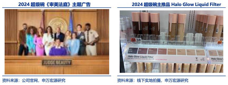 經(jīng)典案例:根據(jù)公司官網(wǎng)、線下實地拍攝、申萬宏源研究等綜合資訊表明,傳統(tǒng)媒介上,E.L.F. BEAUTY 選擇美妝品牌少有涉及的超級碗,打造年度爆品底妝。公司抓住超級 碗帶來的巨大曝光優(yōu)勢,攜手演員 Jennifer Coolidge 拍攝底妝產(chǎn)品 Power Grip Primer 廣告,取得觀眾的積極響應(yīng)。2024 年,公司繼續(xù)沿用超級碗流量,以審美法庭(Judge Beauty) 作為主題,邀請演員 Gina Torres、Rick Hoffman、Sarah Rafferty 等多位明星,打造 Halo Glow Liquid Filter 爆品。
