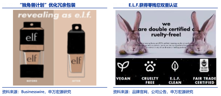 經(jīng)典案例:根據(jù)Businesswire、品牌官網(wǎng)、公司公告、申萬宏源研究等綜合資訊表明,2019 年, e.l.f.啟動“獨(dú)角獸計劃”,致力于通過不斷精簡、優(yōu)化包裝設(shè)計,減少廢棄包裝。2023 年, e.l.f.計劃進(jìn)一步減少 20%的包裝強(qiáng)度。在踐行企業(yè)環(huán)保責(zé)任的同時,更為精簡小巧的包裝 將降低產(chǎn)品包裝成本,并在產(chǎn)品運(yùn)輸及貨架擺放時實(shí)現(xiàn)空間利用最大化,從而提升運(yùn)輸及 倉儲效率,轉(zhuǎn)化為成本的收縮。