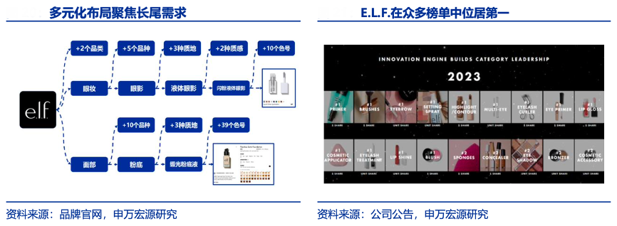 經(jīng)典案例:根據(jù)品牌官網(wǎng)、公司公告、申萬宏源研究等綜合資訊表明,美國消費(fèi)者具有種族、審美、風(fēng)格多元化等 特征,針對用戶日益細(xì)分的長尾需求,e.l.f.推出大量 SKU 予以應(yīng)對。例如,在品牌面部化 妝品品類下,有包含粉底在內(nèi)的 11 個細(xì)分品種,為不同面部區(qū)域、效果提供多樣化產(chǎn)品, 粉底類目下根據(jù)妝效、妝感等需求差異更有 4 種質(zhì)地予以選擇。
