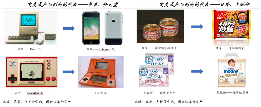 經(jīng)典案例:根據(jù)任天堂官網(wǎng)、蘋果、日冷、尤妮佳官網(wǎng)、國(guó)金證券研究所等綜合資訊表明,卓越的公司在舊的產(chǎn)品生命力進(jìn)入中后期后,有能力通過下一個(gè)重大突變式創(chuàng)新,為公司的增長(zhǎng)打開新的引擎。比如:蘋果推出 iPhone、任天堂推出 DS、尤妮佳進(jìn)軍紙尿褲市場(chǎng)推出“Moony”品牌、日冷推出“正宗炒飯”。