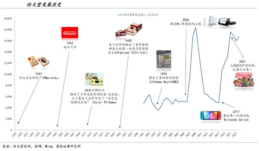 經(jīng)典案例:根據(jù)任天堂官網(wǎng)、國(guó)金證券研究所等綜合資訊表明,任天堂公司是一家具有豐富歷史和全球影響力的游戲企業(yè)。最初作為一家撲克牌生產(chǎn)商,由山內(nèi)房治郎在 1947 年 11 月創(chuàng)立,公司最初名為 Marufuku。隨著時(shí)間推移,任天堂經(jīng)歷了商業(yè)模式的多次變革,并在 20 世紀(jì) 70 年代推出首款游戲機(jī),標(biāo)志著其正式進(jìn)入電子游戲行業(yè)。