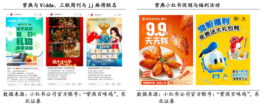 經(jīng)典案例:根據(jù)小紅書公司官方帳號(hào):“紫燕百味雞”、東北證券等綜合資訊表明,紫燕食品公司在社交媒體營(yíng)銷方面逐漸成熟且有著絕對(duì)的領(lǐng)先,而年輕群體在社交媒體用戶占多數(shù),有助于公司在該群體打開知名度,穩(wěn)定未來客源。 為了進(jìn)一步推動(dòng)品牌宣傳,公司與 Vidda、jj 麻將、三聯(lián)周刊等第三方品牌聯(lián)名合作,同時(shí)參與直播賣貨,在線上平臺(tái)進(jìn)行各大促銷與福利活動(dòng)。