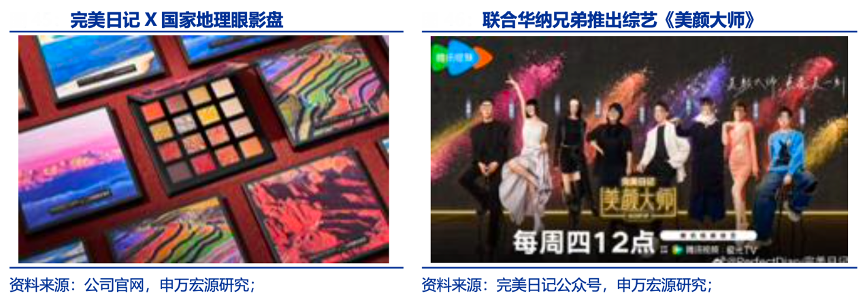 經(jīng)典案例:根據(jù)公司官網(wǎng)、完美日記公眾號(hào)、申萬(wàn)宏源研究等綜合資訊表明,完美日記明星代言人覆蓋多圈層粉絲,現(xiàn)象級(jí)綜藝吸引流量。2023 年 7 月, 完美日記攜手華納兄弟探索打造的國(guó)家化專業(yè)化妝競(jìng)賽類綜藝《美顏大師》開(kāi)播,節(jié)目從成千上萬(wàn)名化妝愛(ài)好者選出了 8 位專業(yè)化妝師選手同臺(tái)競(jìng)技,在為觀眾解決化妝難題的同時(shí)宣傳自家產(chǎn)品以及品牌理念,提升品牌知名度,擴(kuò)大潛在用戶規(guī)模。