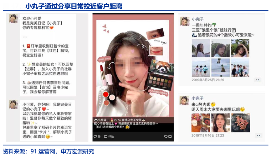 經(jīng)典案例:根據(jù)91運(yùn)營(yíng)網(wǎng)、申萬(wàn)宏源研究等綜合資訊表明,完美日記通過(guò)用戶購(gòu)買產(chǎn)品后獲得的紅包以及新用戶掃碼免費(fèi)送美妝工具等途徑來(lái)獲得用戶微信號(hào),邀請(qǐng)用戶進(jìn)入微信群,并且以“小完子”美妝顧問(wèn)形象添加好友。“小完子”區(qū)別于傳統(tǒng)客服,除去常規(guī)工作,還以 1 條/天的頻率發(fā)布朋友圈或視頻號(hào),宣傳新品同時(shí)也分享生活日常,拉近與年輕客戶群體的距離。