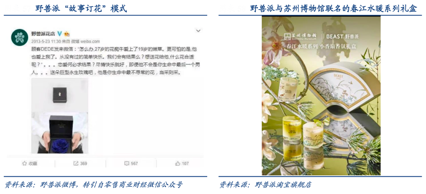 經(jīng)典案例:根據(jù)野獸派微博、轉(zhuǎn)引自零售商業(yè)財(cái)經(jīng)微信公眾號(hào)、野獸派淘寶旗艦店、華創(chuàng)證券等綜合資訊表明,野獸派 2011 年底誕生于微博,早期以賣花為主營,“故事訂花”模式(根據(jù)網(wǎng)友私信所 講述的故事來定制不同的花束,并賦予浪漫命名,為訂花者量身打造專屬產(chǎn)品) 售賣產(chǎn) 品之余,提供更多情緒價(jià)值,讓消費(fèi)者心甘情愿為高溢價(jià)買單。