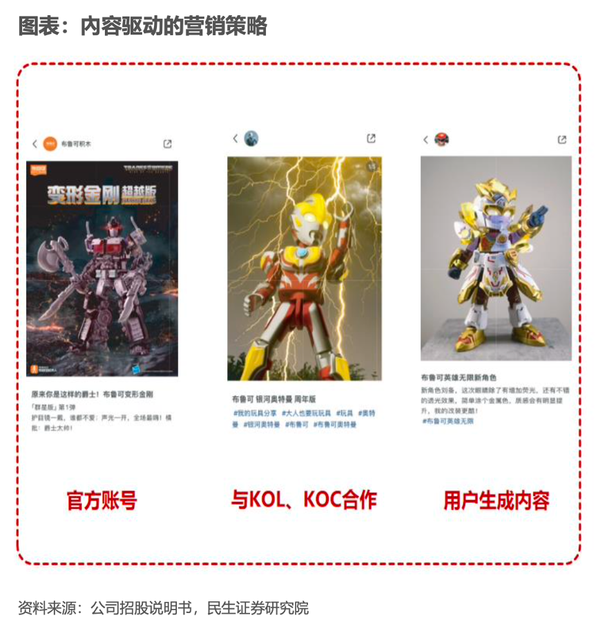 經(jīng)典案例:根據(jù)公司招股說(shuō)明書(shū)、民生證券研究院等綜合資訊表明,布魯可使用多重傳播渠道,如公司官方賬號(hào)及社交媒體平臺(tái)上的 KOL、KOC、粉絲及BFC賬號(hào)。玩具愛(ài)好者積極創(chuàng)作并分享視頻和帖子,這些內(nèi)容在社交媒體平臺(tái)上獲得了數(shù)以百萬(wàn)計(jì)的播放量。在2023及2024年內(nèi)與布魯可合作的KOL 和KOC在2024年3月31日擁有全網(wǎng)粉絲數(shù)約1.60億。