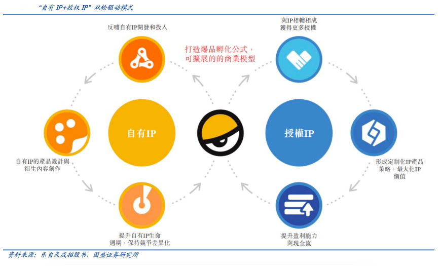 經(jīng)典案例:根據(jù)樂自天成招股書、國盛證券研究所等綜合資訊表明,樂自天成公司以“自有 IP+授權(quán) IP”雙輪驅(qū)動模式,構(gòu)建全年齡段、全場景 IP 矩陣。自有 IP 的 成功運營驗證了公司在孵化、設(shè)計和運營方面的專業(yè)能力,助力獲取全球頂級 IP 授權(quán)。公司業(yè)務(wù)主要為產(chǎn)品銷售,其包括三個部分,分別為自有 IP、授權(quán) IP 和外 部采購。2024 年公司總收入為 6.3 億元,同比增長 30.65%。