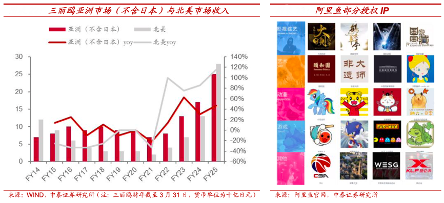 經(jīng)典案例:根據(jù)WIND、阿里魚官網(wǎng)、中泰證券研究所等綜合資訊表明,阿里魚自 2016 年成立以來,阿里魚目前擁有的 IP 矩陣覆蓋了二次元、文博文創(chuàng)、影視綜藝、教 育體育等多個(gè) IP 類型,簽約了三麗鷗家族、寶可夢(mèng)、環(huán)球影業(yè)、蠟筆小 新、Chiikawa 等多個(gè)全球優(yōu)質(zhì)頭部 IP。