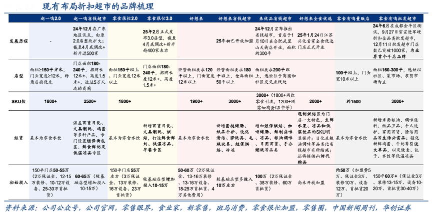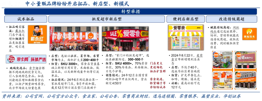 經(jīng)典案例:根據(jù)公司官網(wǎng)、公司官方公眾號、食業(yè)家、公司公告、零售商業(yè)財經(jīng)、逸馬連鎖圈、零售眼界、贏壁實業(yè)、華創(chuàng)證券等綜合資訊表明,中小量販品牌紛紛開啟拓品、新店型、新模式。