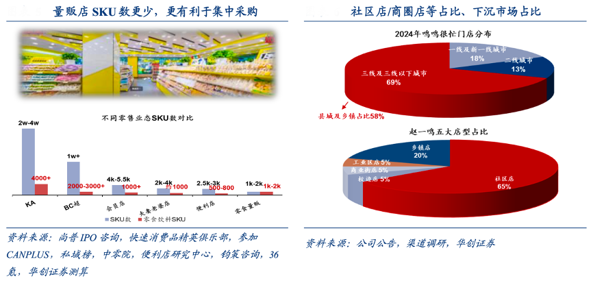 經(jīng)典案例:根據(jù)尚普IPO咨詢、快速消費品精英俱樂部、參加CANPLUS、私域榜、中零院、便利店研究中心、鈞策咨詢、36氪、公司公告、渠道調(diào)研、華創(chuàng)證券等綜合資訊表明,從近兩年實際運營來看,量販行業(yè)擴張增速快于預(yù)期,門店數(shù)量由 2021 年的 2500 家左右快速擴張至 2024 年底的超過4 萬家,且從行業(yè)龍頭鳴鳴很忙門店分布看,縣城及鄉(xiāng)鎮(zhèn)門店占比達 58%,下沉市場占據(jù) 主體。