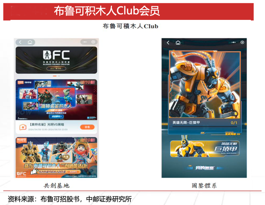 經(jīng)典案例:根據(jù)布魯可招股書(shū)、中郵證券研究所等綜合資訊表明,布魯可公司設(shè)立多渠道會(huì)員計(jì)劃,包括微信小程序布魯可積木人Club和各大電商平臺(tái)旗艦店會(huì)員。通過(guò)布魯可積木人Club,公司為消費(fèi)者提供多樣的互動(dòng)體驗(yàn),其發(fā)布圖片和文字,分享他們的收藏和二次創(chuàng)作作品;截至2024H1,公司在布魯可積木人Club 上擁有約200萬(wàn)注冊(cè)會(huì)員。