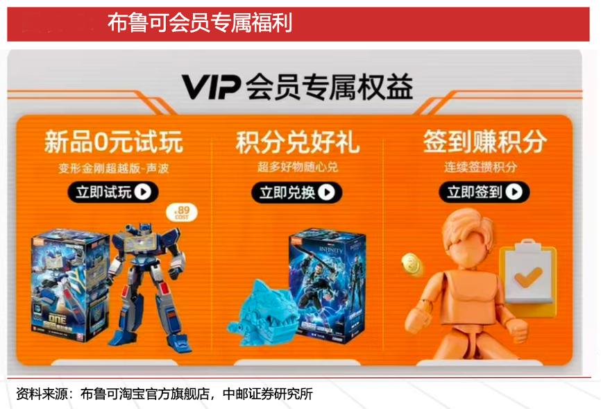 經(jīng)典案例:根據(jù)布魯可淘寶官方旗艦店、中郵證券研究所等綜合資訊表明,布魯可公司在各電商旗艦店針對(duì)不同會(huì)員等級(jí)提供福利,截至2024H1,公司各電商旗艦店擁有超過(guò) 880 萬(wàn)名粉絲。