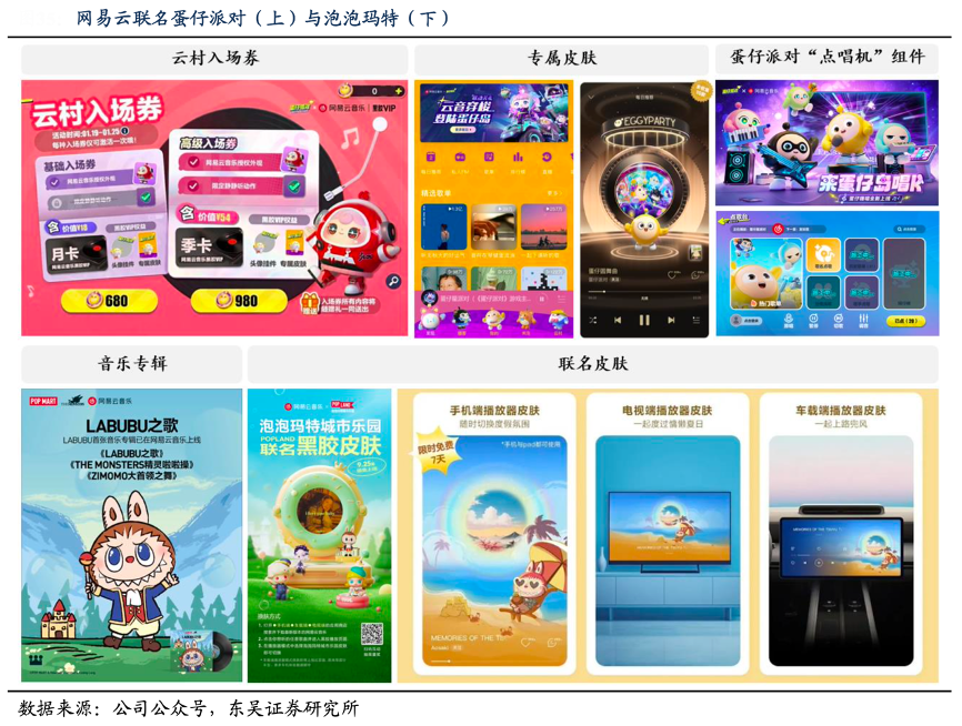 經(jīng)典案例:根據(jù)公司公眾號、東吳證券研究所等綜合資訊表明,近年來網(wǎng)易云音樂公司不斷創(chuàng)新聯(lián)名方式,2023 年 9 月,網(wǎng)易云音樂推出泡泡瑪特城市樂園聯(lián)名黑膠皮膚,包括 MOLLY、LABUBU、SKULLPANDA、DIMOO 專屬播放器皮膚;2024 年 7 月,網(wǎng)易云音樂上線 LABUBU 首張音樂專輯,并推出 LABUBU 夏日主題聯(lián)名皮膚。