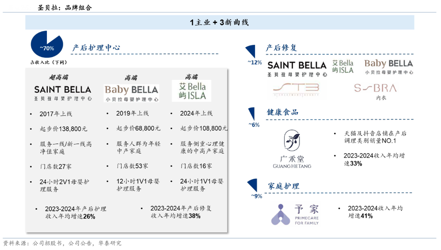 經(jīng)典案例:根據(jù)公司招股書、華泰研究等綜合資訊表明,圣貝拉公司以月子中心為主業(yè),2024 年月子中心護(hù)理占收入 85%(含產(chǎn)后修復(fù))。旗下包含 圣貝拉、小貝拉和艾嶼 3 個品牌,分別聚焦超高端需求、高端需求和女性心理健康月子護(hù)理賽道。