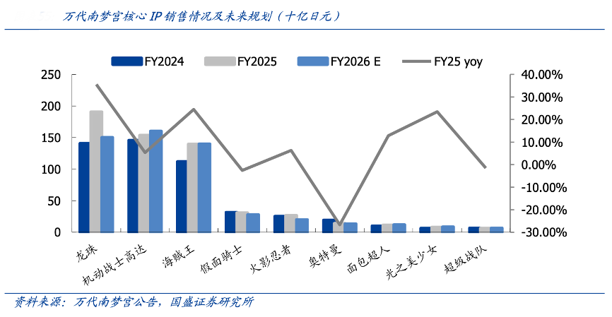 經(jīng)典案例:根據(jù)萬(wàn)代南夢(mèng)宮官網(wǎng)、國(guó)盛證券研究所等綜合資訊表明,萬(wàn)代 FY2025.3 中 期數(shù)據(jù)顯示,公司整體 IP 銷售由頭部三大 IP 主導(dǎo),增長(zhǎng)趨勢(shì)顯著,其中《龍珠》FY2025.3 集團(tuán)銷售達(dá) 1906 億日元,同比增長(zhǎng) 35.56%,體現(xiàn) IP 在多業(yè)態(tài)并行下的強(qiáng)內(nèi)容帶動(dòng)力。