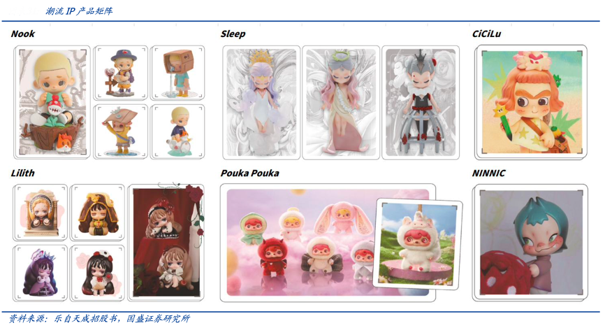 經(jīng)典案例:根據(jù)樂自天成招股書、國盛證券研究所等綜合資訊表明,樂自天成的潮流IP主要面向年輕一代的流行文化愛好者。除自主開發(fā)的Nook、Sleep、Lilith 等 IP 外,公司還通過收購獲得了外部藝術(shù)家開發(fā)的 CiCilu、NINNIC 和 Pouka Pouka 等潮流 IP 的版權(quán)。
