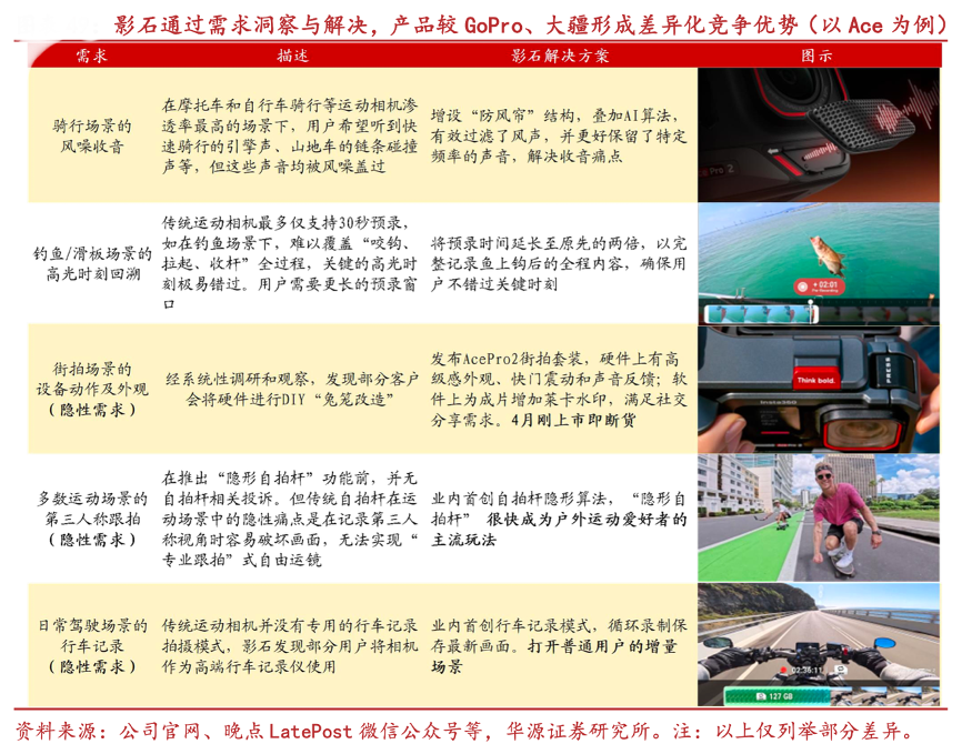 經(jīng)典案例:根據(jù)公司官網(wǎng)、晚點(diǎn)LatePost微信公眾號(hào)等、華源證券研究所等綜合資訊表明,復(fù)盤影石產(chǎn)品發(fā)展歷程,公司創(chuàng)新的推出了一系列實(shí)用功能,滿足了全景/運(yùn)動(dòng)相機(jī)不同場(chǎng)景 的細(xì)分需求。如推出騎行“防風(fēng)簾”:為了保留快速騎行的引擎聲,同時(shí)消除風(fēng)噪,公司開發(fā)了騎行防風(fēng)簾結(jié)構(gòu),并疊加 AI 算法,可有效過濾風(fēng)聲。